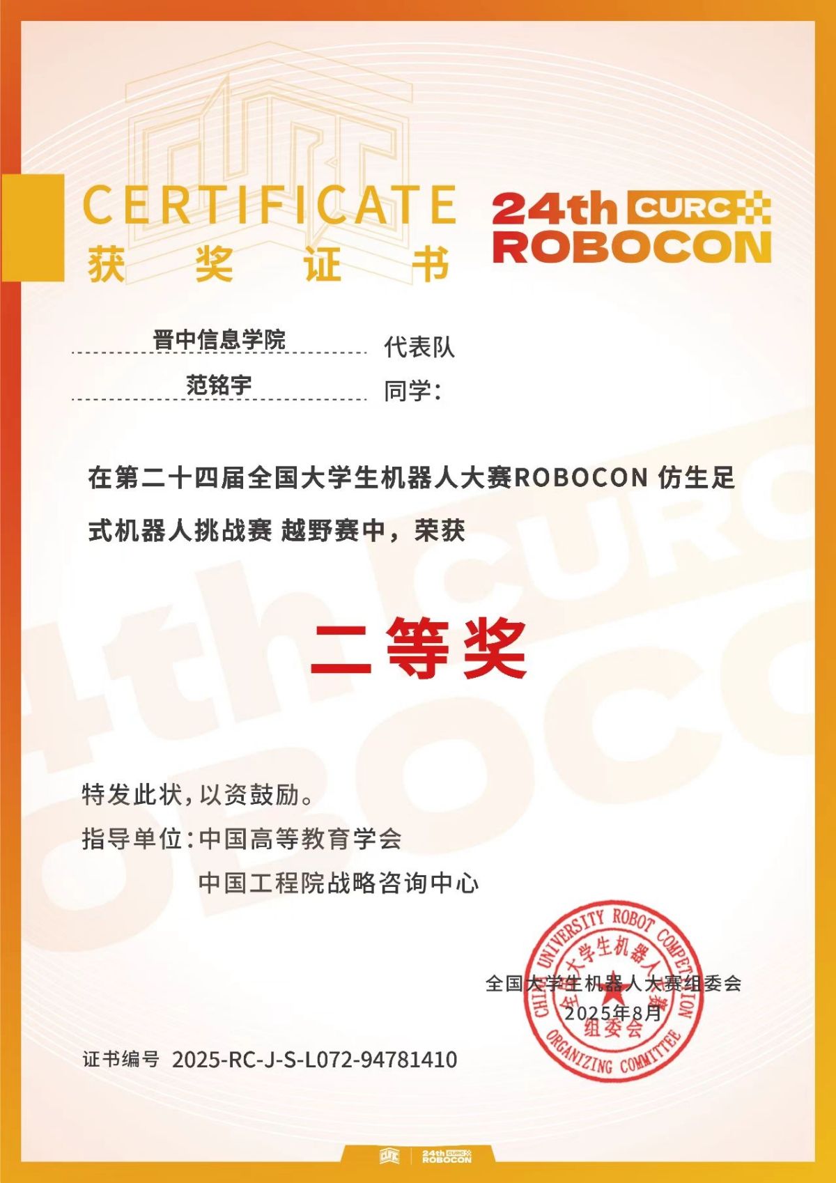 课堂之外,他将热情投注于学科竞赛,视其为检验所学、拓展能力的最佳试炼场。多少个深夜里,他与队友为了一段算法、一处机械结构反复推敲调试。那段日子虽辛苦,却也在机器人顺利完成指令的瞬间,凝结为最真实的成就感。凭借不懈努力,他在多项国家级赛事中斩获荣誉:第二十四届全国大学生机器人大赛ROBOCON二等奖、2025年中国大学生工程实践与创新能力大赛一等奖、第十八届“高教杯”全国大学生先进成图技术与产品信息建模创新大赛三等奖等。