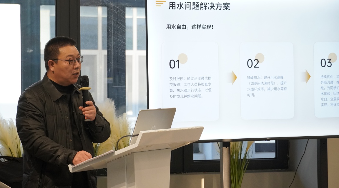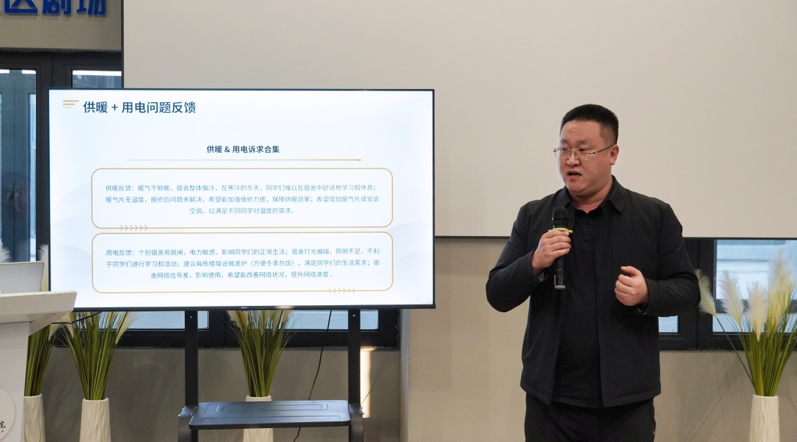 首先,孔老师围绕部分学生宿舍存在的共性问题进行梳理。用水方面,水温偏低、饮水机故障等问题;用电与网络方面,供电设施频繁跳闸、灯光较暗、网络信号不稳定等故障;供暖方面,暖气温度不足、报修后处理不及时等情况;此外,宿舍生活中的噪音干扰、楼道吸烟等行为也影响了学生的生活与学习环境。