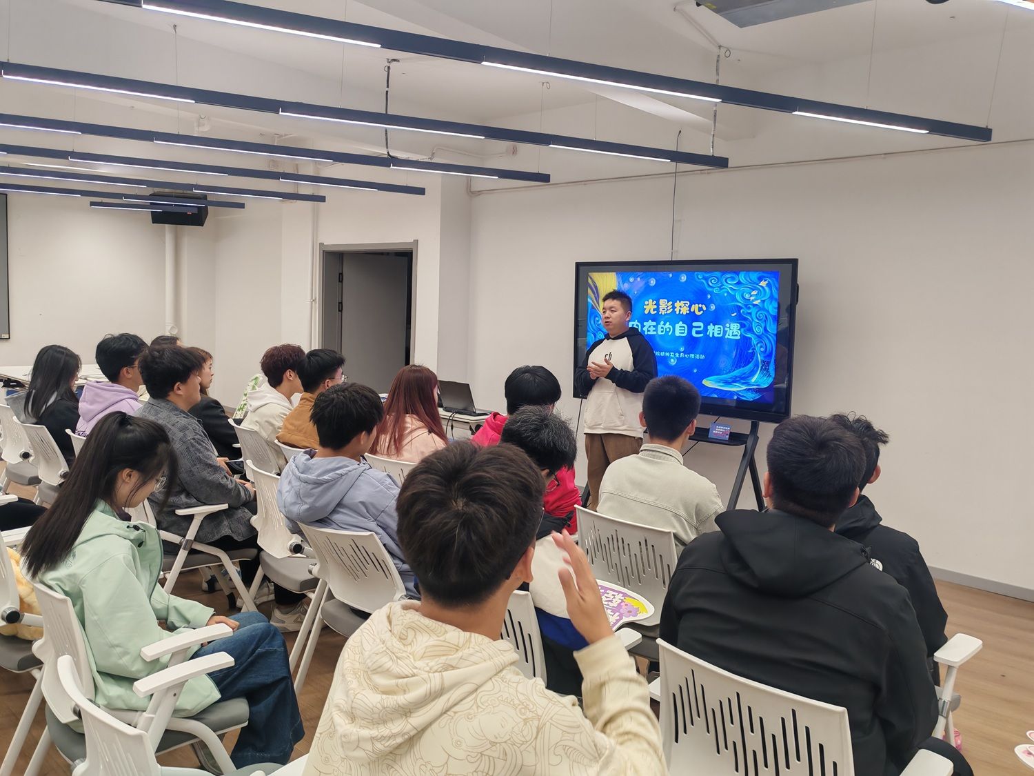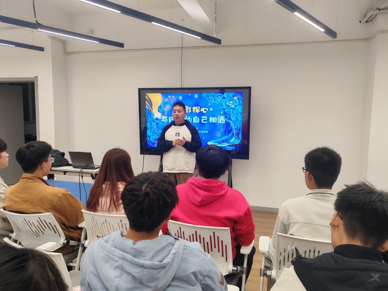 紧接着,彭老师将影片的启示与大学生的现实生活紧密相连,为同学们提供了宝贵的成长建议。他谈到:“在大学阶段,许多同学会陷入‘目标焦虑’,急于寻找一个宏大的意义来定义自己的人生,一旦暂时没有找到,便容易感到迷茫和自责。乔伊和‘二十二’的故事,正是对我们的一种提醒——生命的意义不是一个需要被‘找到’的标准答案,而是在每一个‘活着’的当下被体验和创造的。”他鼓励同学们,在勤奋学习、追求长远目标的同时,更要学会培养“活在当下”的能力,用心去感受课堂上的每一次灵感迸发、完满活动中的每一次协作共鸣、校园里四季变换的美好景致,这些看似微小的瞬间,正是构成我们生命厚度与宽度的“火花”,是支撑我们穿越压力与迷茫的宝贵心理资源。