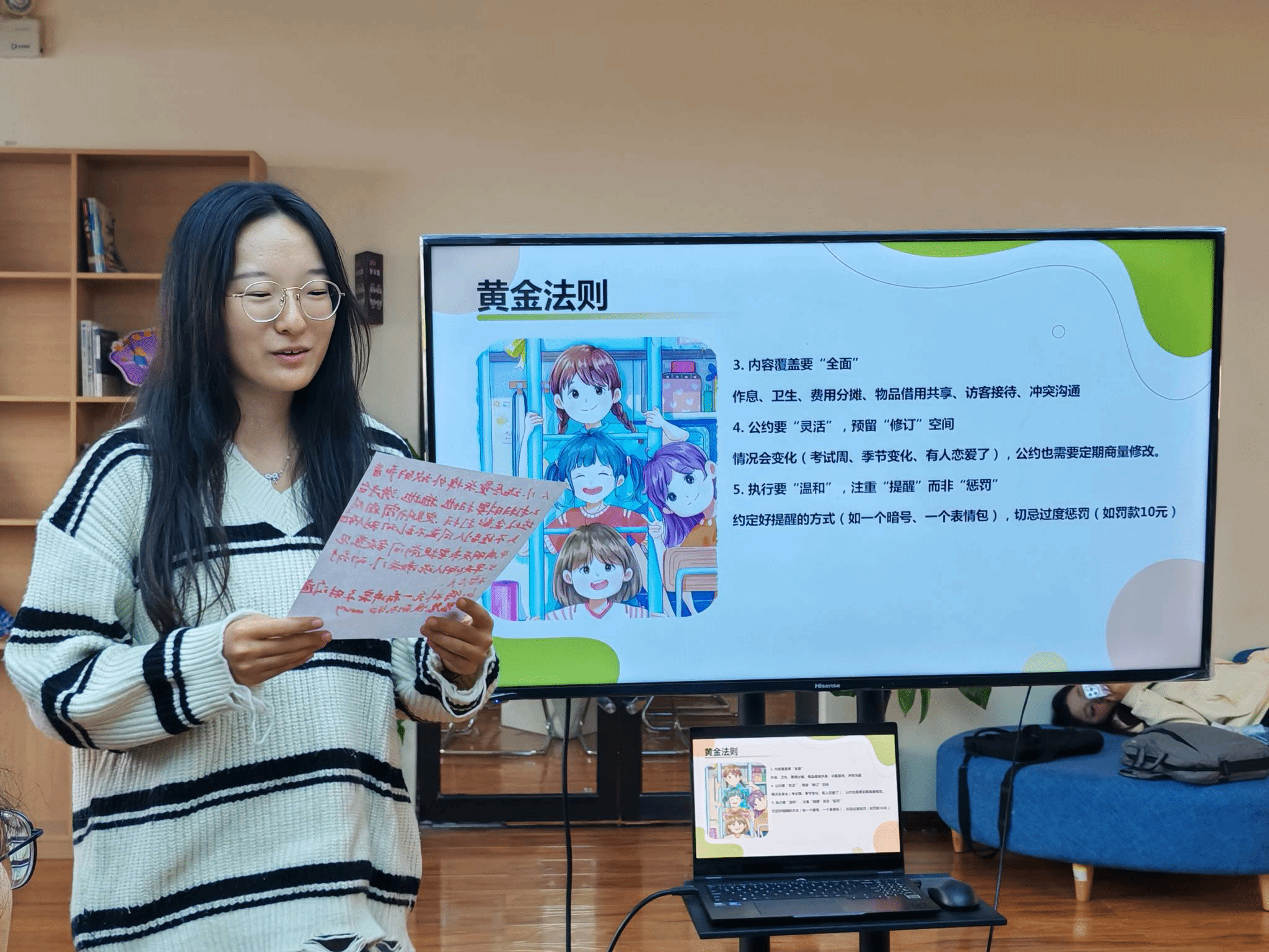 为助力同学们更好地经营宿舍这个“青春小家”,心理老师近期走进各书院开展讲座,聚焦“宿舍公约制定”与“集体生活适应”两大核心议题,一改单向宣讲,通过生动案例和情景互动,引导宿舍长学习如何组织室友高效商讨,将作息、卫生、公共空间使用等规则,从“生硬的规定”转化为大家共同商讨出的、愿意主动遵守的“小家守则”,同时,针对作息冲突、习惯差异等常见“磨合期”烦恼,老师也传授了“非暴力沟通”、积极倾听等暖心金句与化解技巧,帮助宿舍长从“管理者”成长为促进包容的“关键成员”,为构建和谐文明的宿舍环境打下坚实基础。