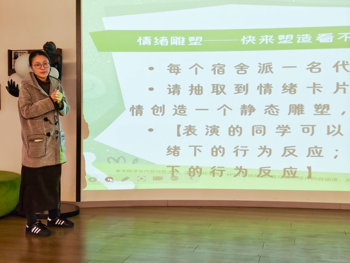 “情绪雕塑”环节率先点燃了现场氛围。同学们通过抽取情绪卡片,或惟妙惟肖地模仿舍友神态,或全然投入地演绎自身反应,将抽象情绪化为可感画面,引得台下笑声不断,潜移默化间增进了彼此理解。“人际雕塑”环节则通过“场景重现-雕塑定格-定格分享-感谢致意”四部曲,三支队伍依次登场,从矛盾产生到冷战僵局,参与者沉浸于角色之中,不仅真诚剖析内心感受,更携手为剧情中的“他们”寻找改善关系的金点子。最后,“自我成长拼图”环节借助“四格法”帮助大家梳理现状与资源,明确成长方向与行动路径。整场活动层层递进,有效促进了宿舍成员间的理解与共情。