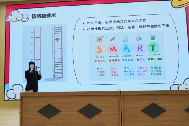 为充分践行“将心理健康教育落到实处,把关爱学生心理放在育人首位”的理念,刘老师向同学们系统介绍了在面临人际、学业、情绪等诱发因素时实用且好操作的心理调适工具:通过“五分钟情绪管理”帮助学生快速平复开学焦虑;借助“感恩三件小事”引导学生每日聚焦积极体验;同时引入“SMART目标模型”指导学生科学制定新学期计划;并以“PERMA幸福五要素”为框架,阐释积极情绪、投入、人际关系、意义和成就如何共同构建蓬勃绽放的生活状态。这些“用得上、带得走”的方法是同学们面对新学期挑战时触手可及的底气,真正实现了心理育人从“入耳”到“入心”的落地生根。