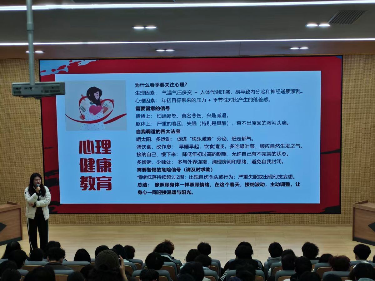 此外,针对春季情绪波动特点,大一辅导员从生理与心理双维度剖析成因,系统介绍了“调整作息、增加运动、接纳自我、主动倾诉”四大自我调适方法,引导学生像照顾身体一样照顾情绪,并提醒关注持续情绪低落、自伤念头等危险信号,倡导及时寻求专业帮助。