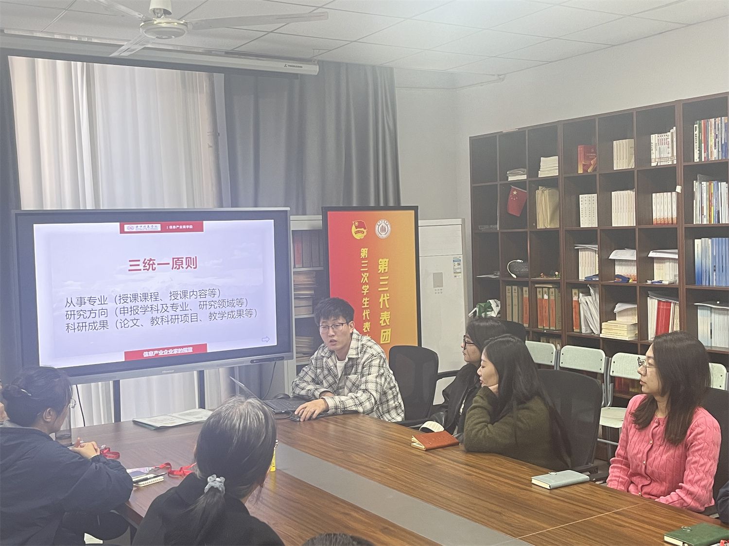 培训中,杜鹏科长以政策解读为核心,结合学校人事管理最新细则,围绕“晋升渠道梳理”与“职称评选要点”两大模块展开深入讲解。在晋升渠道方面,他系统梳理了辅导员从初级到高级的纵向晋升路径,以及“管理岗-专业技术岗”双向转聘的横向发展通道,用清晰的流程图解让复杂的晋升体系一目了然;针对讲师、副高职称评选,他重点拆解了申报条件中的核心指标,从教学科研成果、学生工作业绩、社会服务贡献等维度,逐一明确材料准备要求与评审侧重点,并结合往年典型案例,提醒辅导员避开常见申报误区,提前规划业绩积累方向。
