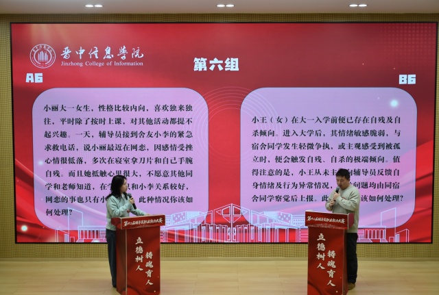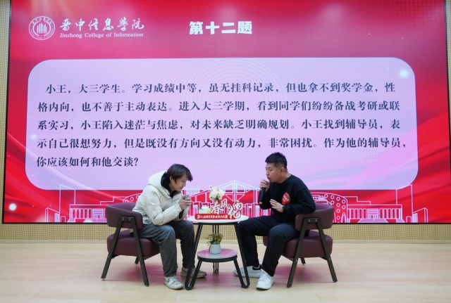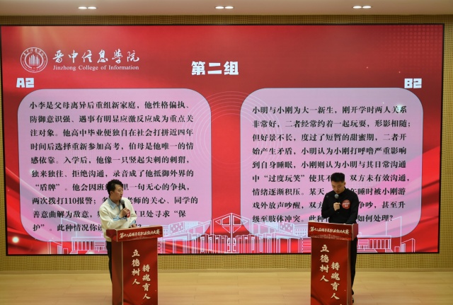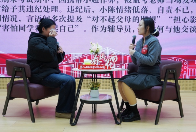 谈心谈话环节则采用情景再现的方式,选手现场抽签决定比赛先后顺序。此次谈心谈话的题目涵盖了学生学业压力、就业焦虑、人际关系冲突、情感困扰等多个方面,考验辅导员对学生特征、学生成长成才规律的了解把握程度,以及教育引导能力和解决实际问题的能力。
