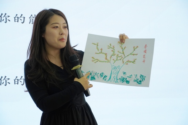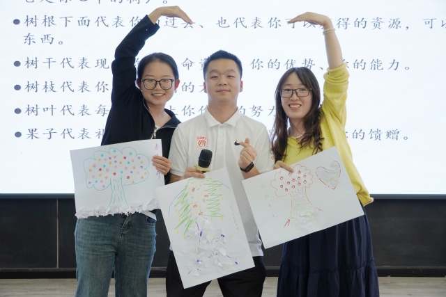 最后,培训进入生命树绘画与价值重建环节。李老师引导大家在A3纸上绘制属于自己的“生命树”,并将在互动环节“抛弃”的碎片拾起,重新粘贴在生命树上,让“破碎”转化为“独特风景”,使其变为职业成长的动能,让职业价值在生命树上落地生根。大家围聚在一起,将各自的生命树拼成一幅完整的价值画卷,用故事表述、肢体讲述共同演绎这份专属的价值追求与精神力量。