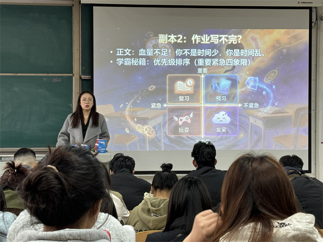 温老师以沉浸式“学霸逆袭”为主线,打破传统说教模式,让学风教育变得生动有趣、干货满满。本次班会以“人生读档、重新选择”为创意切入点,通过趣味互动、技能解锁、任务闯关、温馨互动等环节,让同学们在轻松氛围中掌握高效学习方法。从“是否选择逆袭当学霸”的现场投票,到艾宾浩斯记忆法、费曼学习法、番茄钟工作法等科学学习技能的讲解,再到“青铜—白银—黄金—钻石—王者”的学习进阶路线图,同学们清晰定位自身学习状态,收获实用提分技巧。