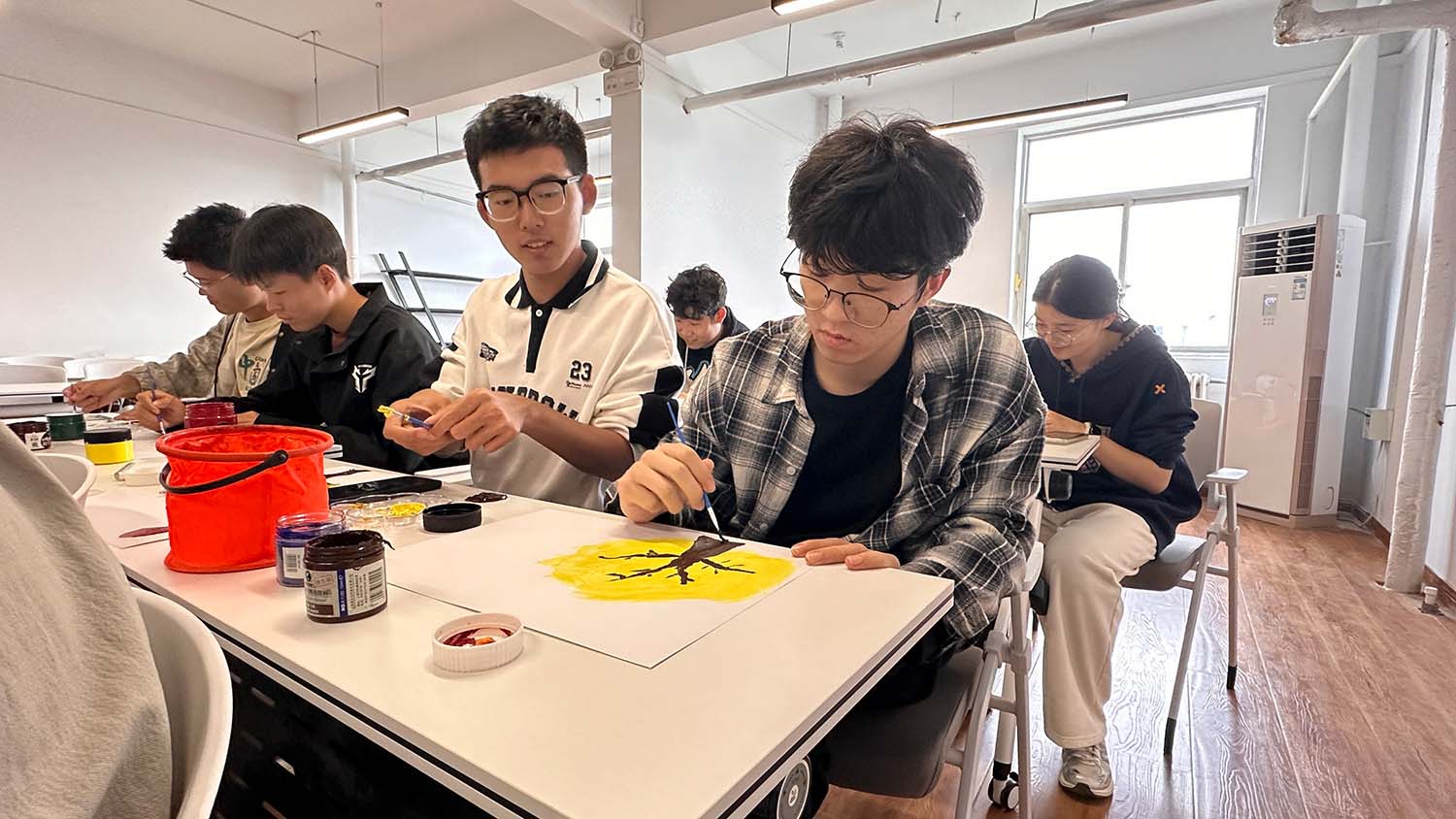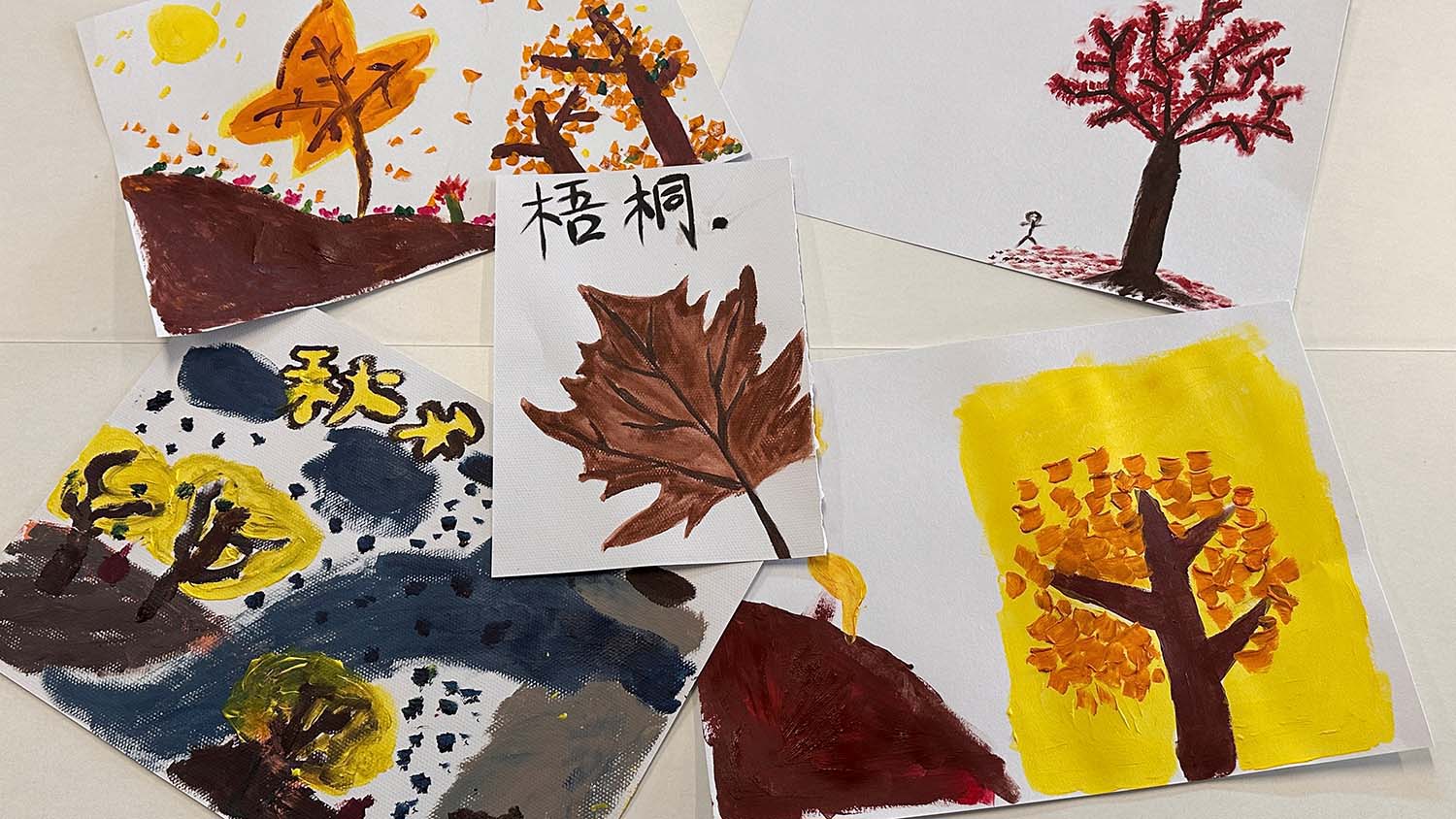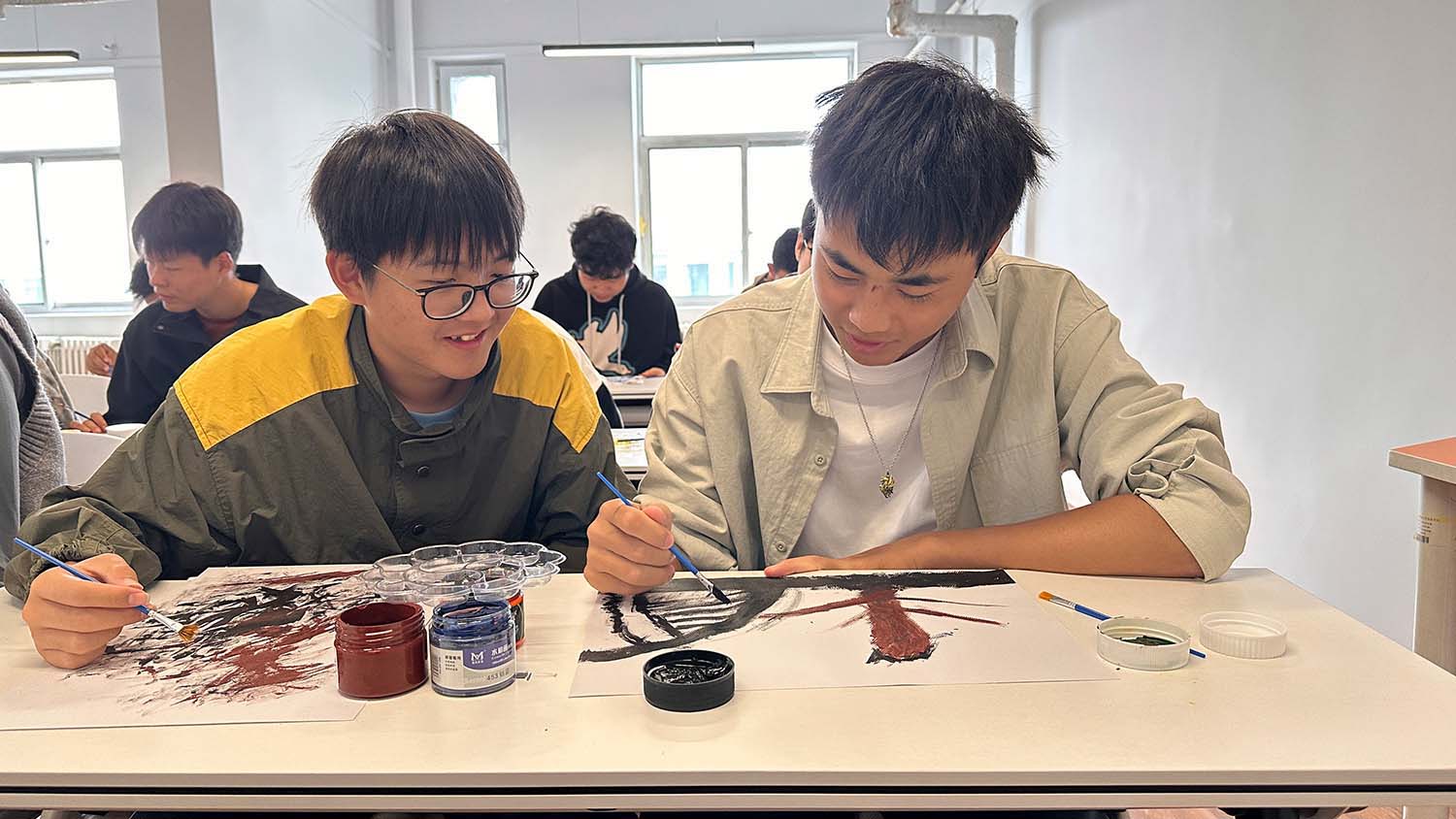 提笔创作,用色彩诉说心事。活动现场,学生们围坐桌前,有的低头沉思寻觅灵感,有的挥毫勾勒释放心绪,正将记忆里的秋景与心底的情愫,细细揉进每一寸画布。暖橙与明黄铺展的画面,将秋日阳光的明媚牢牢定格。黑棕两色勾勒的笔触,静静诉说着梧桐树的季节更迭。丰富色彩堆叠的层次,让秋日里的多元情绪有了具象模样。每一幅作品,都是独特色彩与巧思构图的融合,更像是一扇窗,将学生们丰盈的内心世界,直观地呈现在眼前。