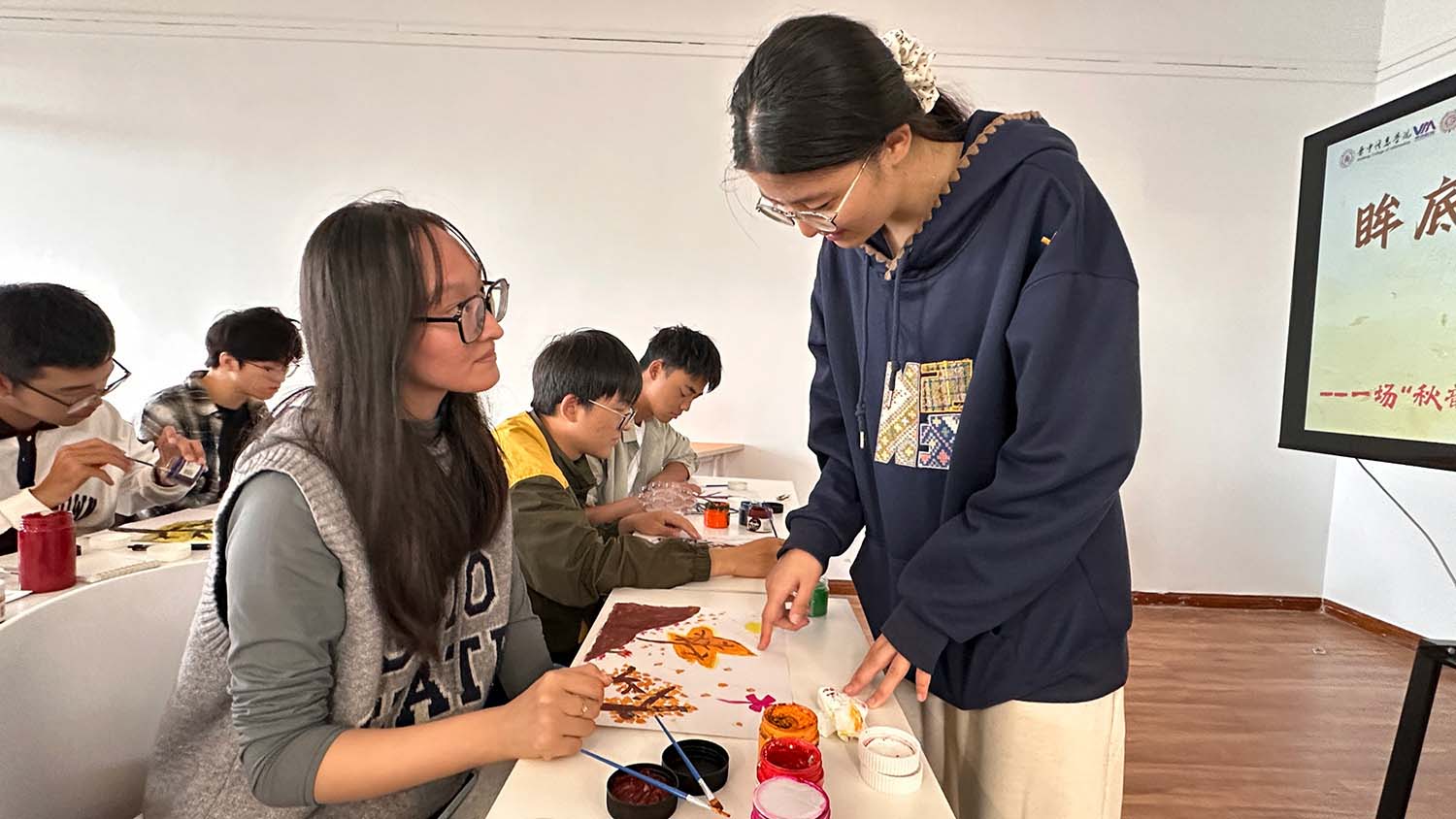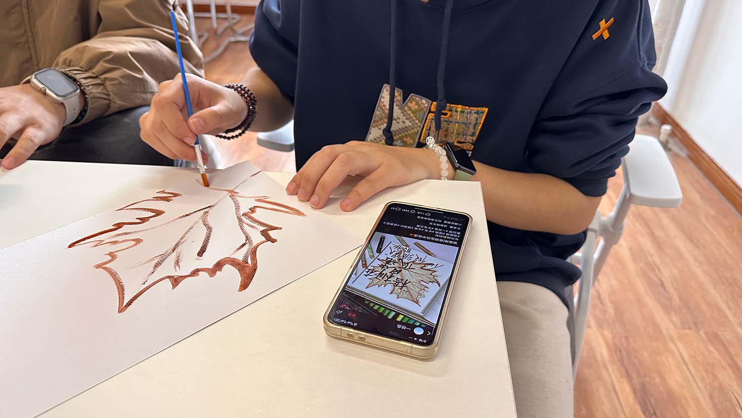 忆秋启思,让心灵与秋日共鸣。活动开场,围绕秋景的萧瑟意韵,工作人员娓娓道来,在生动讲解中引导学生打开记忆闸门,唤醒曾与秋天相关的细碎感受与深刻印象。“大家可以回想,印象里的秋天是怎样的?是老家院子里晒着的金黄玉米,还是街边飘着香气的糖炒栗子?这些画面里藏着我们当下的心情。”随着引导,学生们纷纷沉思,开始回忆记忆中的秋天。这一环节让学生暂时脱离忙碌的学习节奏,在对秋日的回忆与联想中放松身心,为后续绘画创作积累“心”素材。