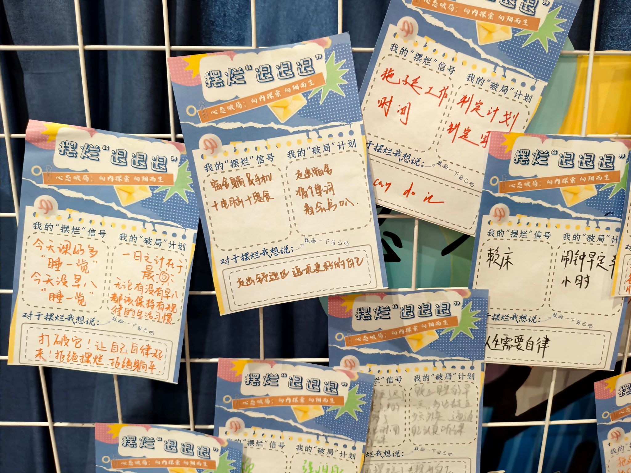 “摆烂‘退退退’”环节将活动氛围推向高潮。工作人员提供便签于正面写下“学业摆烂行为”,背面对应填写“小突破行动”。同学们认真思考后,纷纷写下“制定的复习计划总完不成”等各种各样摆烂行为,同时在便签背面上给出具体对策,写完后大家有序将便签贴在主题黑板上,不少同学拿出手机拍照记录实用方法。