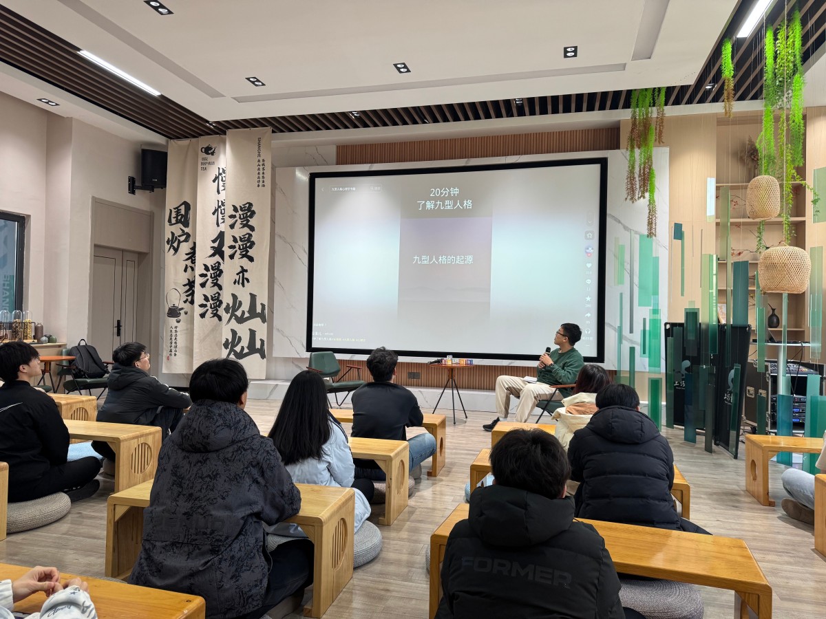 随后的理论科普环节,通过趣味科普视频与生动PPT讲解,将抽象的理论变得通俗易懂。视频中生活化的案例、PPT里清晰的特质对照表,让学子们快速了解了完满人格的起源和9种人格类型的核心动机与典型行为表现。大家一边听讲解,一边对照自己的“人格猜想”,不时与身边同学小声交流,现场互动氛围十分热烈。