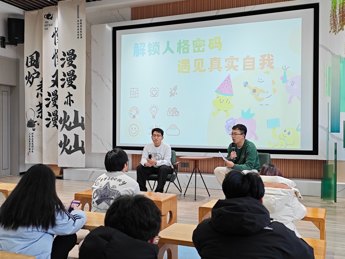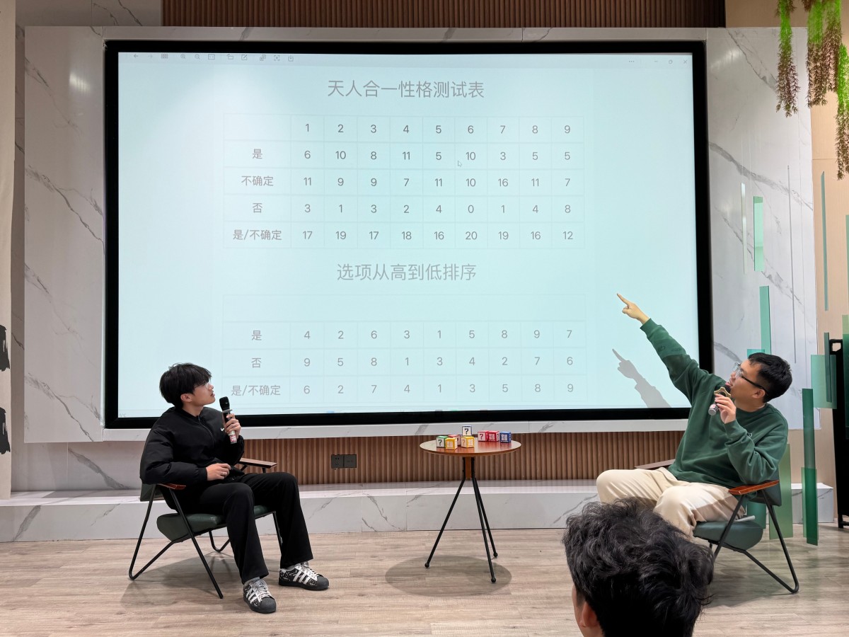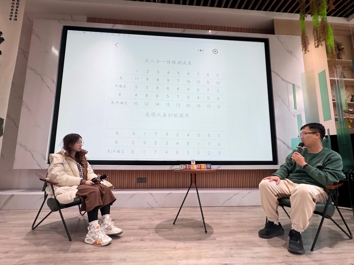 暖场破冰环节便点燃了现场氛围。主持人邀请参与者逐一分享:“我是小李,想搞懂自己为啥总爱追求完美,我猜我是‘完美型’人格!”“我叫小王,平时爱热闹、喜欢交朋友,我觉得自己应该是‘活跃型’”学生们踊跃发言,大胆猜想自己的完满人格类型,独特的环节既打破了陌生感,也让现场充满了欢声笑语,为后续的深度互动奠定了轻松包容的基础。
