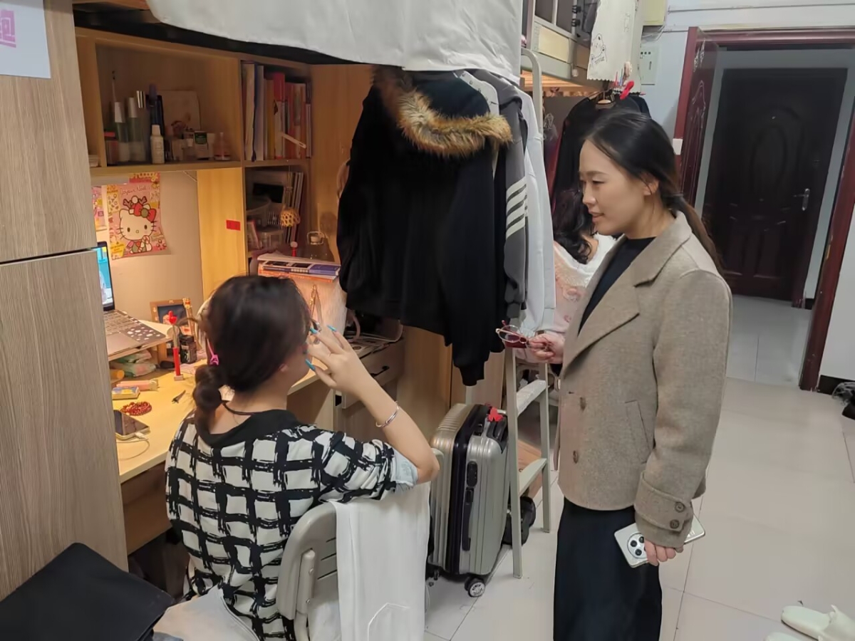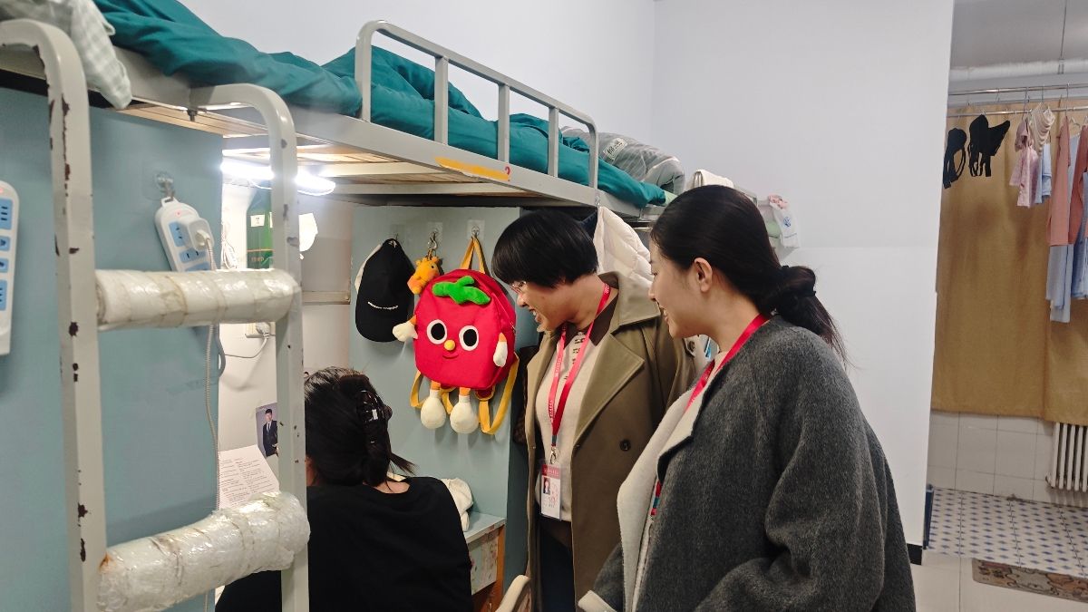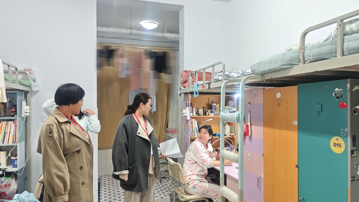 在检查中,注意到部分同学在遵守学生公寓管理规定的前提下,对宿舍进行了个性化的合理改造与装饰,如使用统一的收纳工具、张贴励志字画、摆放绿植等,为宿舍增添了文化气息与生活乐趣。检查组老师对此类积极改善居住环境的行为给予了肯定,同时提醒同学们,任何改造都必须在确保安全、不破坏宿舍原有结构、不影响公共安全的前提下进行,严禁私拉乱接、使用违规建材等行为,并结合近期举办星级宿舍评选活动的要义,听取同学们的宿舍故事,了解同学们的业余爱好等,引导同学们与舍友携手布置“公寓新家”。