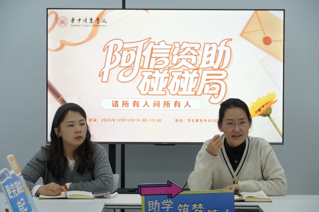 初雪敲窗,校园裹上一层蓬松的银白绒毯。12月12日14:30,晋中信息学院“阿信资助碰碰局——请所有人问所有人”资助座谈会温情启幕。学生处张静、张甜甜两位老师与受助学子围坐一堂,窗外雪花簌簌,屋内暖意融融,一场与初雪撞个满怀的暖心之约,就此展开。