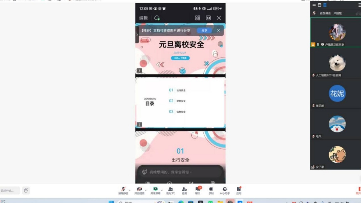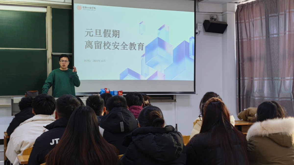 元旦佳节将至,为切实保障全体学生假期出行安全、财产安全及身心健康,进一步强化学生的安全防范意识和自我保护能力,12月29日,智能工程学院各年级辅导员分别组织召开了元旦假期安全教育主题年级会,覆盖大一至大四全年级学生,将安全防护的“金钟罩”织密织牢,为学生平安过节保驾护航。