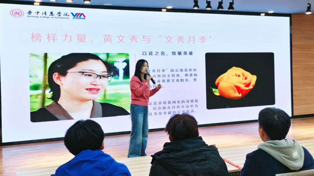 大屏幕亮起,黄文秀在百色大山奔走的背影、贺娇龙策马雪原的英姿,让同学们不自觉专注起来。随后,两朵娇艳的月季映入眼帘——明黄灿烂的“文秀月季”与粉雅温润的“娇龙月季”,其背后的故事被侯老师缓缓道来。