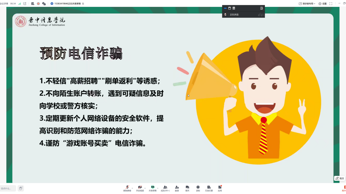 除此之外,各年级辅导员结合近年来发生在省内高校及身边同学的真实案例,详细拆解了诈骗分子的作案手法、话术套路与心理诱导技巧。使学生深刻体会电信诈骗对个人财产、学业生活与家庭造成的严重危害。
