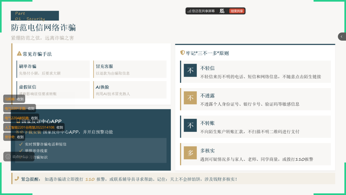 此次活动,各辅导员围绕当前高校高发、易发的电信网络诈骗类型展开系统讲解。重点剖析了网络刷单返利、冒充客服退款、虚假校园贷、游戏账号交易诈骗、冒充熟人或老师转账、AI换脸诈骗、共享屏幕诈骗、求职收费陷阱等针对大学生的典型骗局。