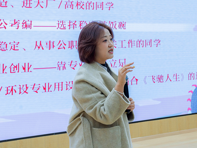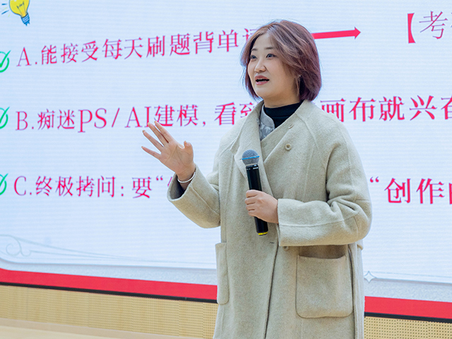辅导员高雅姝老师结合视觉传达设计专业特色,以2026考研录取线为基准,从考研关键节点、考公考编备考重点,到春招窗口期与融媒体设计、UI设计、高校教师等多元岗位方向,为同学们提供了可落地、能实操的规划指南,用翔实干货为大家的前行之路装上强劲引擎。强调“按自己的节奏跑,不被别人的‘时速’干扰,你才能在自己的赛道上跑出最快圈速。”引导大家坚守自身节奏,不被外界的步伐干扰,在专属赛道上笃定前行,跑出属于自己的精彩与辉煌。