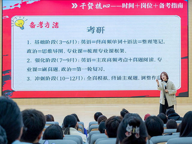 通过这场别开生面的赛道规划课,同学们不仅认清了自身优势、明晰了考研、考公考编、就业创业三大发展路径,更学会了拒绝内耗、理性规划、从容前行,为今后的专业学习与职业发展奠定了清晰、稳定、可持续的方向。现场举手显示,91%的同学在活动后清晰了自身职业规划。大家带着更坚定的信念、更务实的目标、更饱满的状态,在属于自己的成长赛道上从容出发、稳步向前,奔赴属于自己的精彩未来。