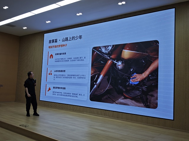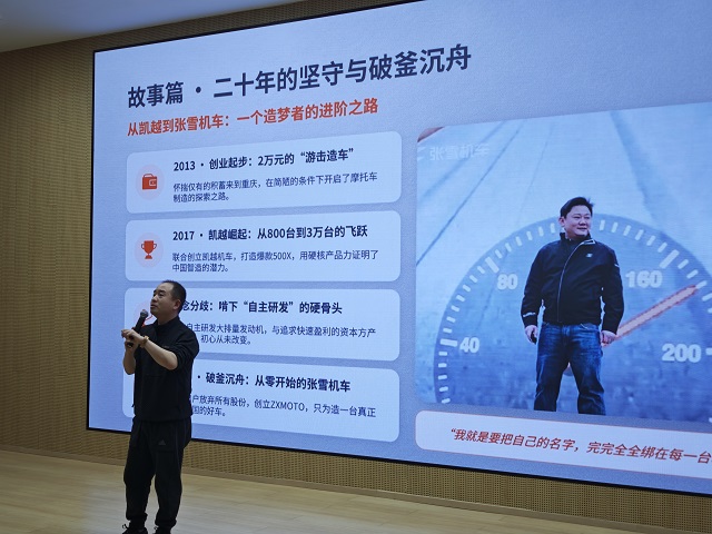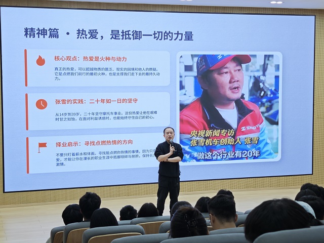 大屏幕亮起,一张张雪机车创始人张雪在车间里俯身调试发动机的照片,吸引了所有人的目光。杜老师娓娓道来张雪的故事:他出身普通,从小痴迷摩托车,却屡遭家人反对和资金困窘。最初在简陋的车库里敲敲打打,做出的零件没人认可,研发的车型一度失败。旁人劝他“换个赛道”,他却说:“我不怕慢,只怕停。”十余年里,他从一个人、一把焊枪开始,一步步打磨技术、积累口碑,最终创立了“张雪机车”品牌,让国产机车驶上了国际舞台。