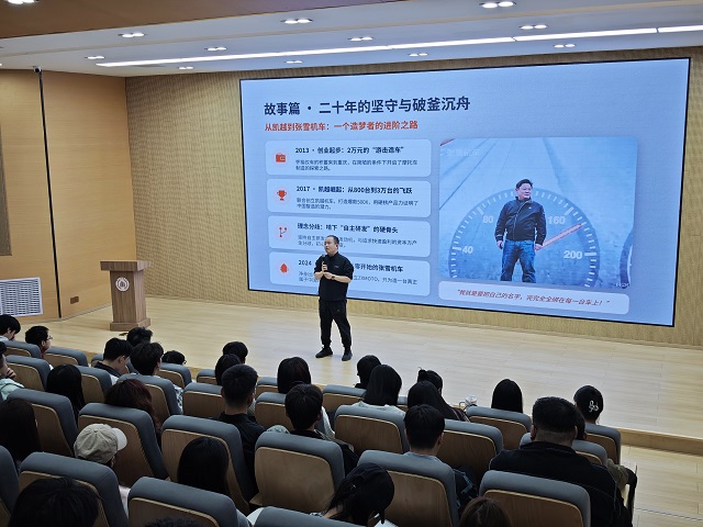这番话让台下不少同学陷入沉思。杜老师接着展示了两张对比图:一张是张雪早期破旧的工作台,一张是如今整洁的现代化车间。“你们未来也会有自己的‘破旧工作台’阶段,别怕,那就是光亮的起点。”
