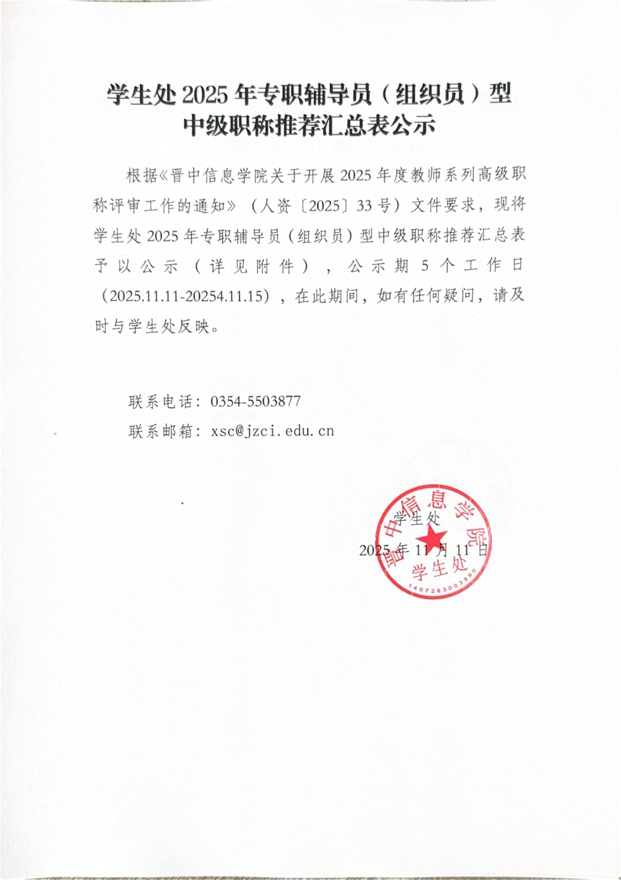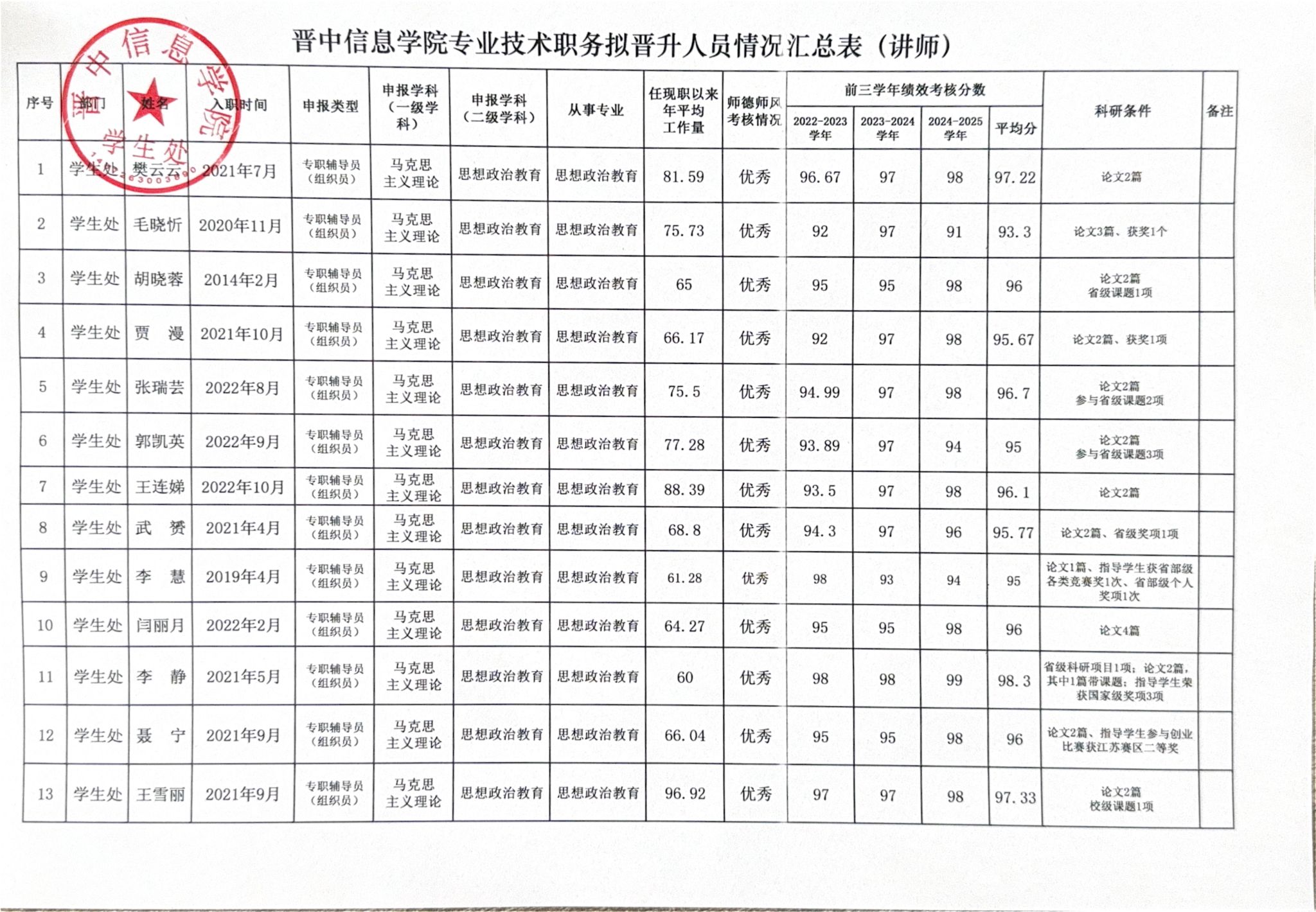 学生处2025年专职辅导员(组织员)型中级职称推荐汇总表公示