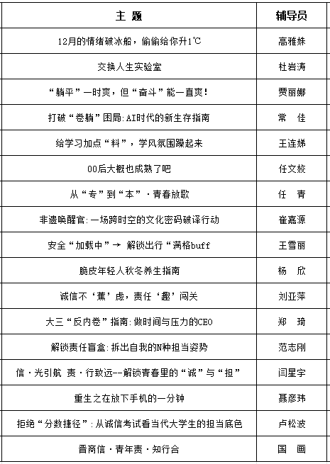 主题年级会是我校大学生思想政治教育的重要举措。为表彰优秀,树立榜样,进一步提高我校“辅导员说完满”(主题年级会)开展的质量。根据《晋中信息学院“辅导员说完满”(主题年级会)实施方案》的文件精神,通过辅导员自主申报、教师、学生评审小组现场观摩、各学院学工副院长、各职能部门负责人评分四个环节,最终评选出17位辅导员为2025年12月优秀“辅导员说完满”(主题年级会)。具体名单如下: