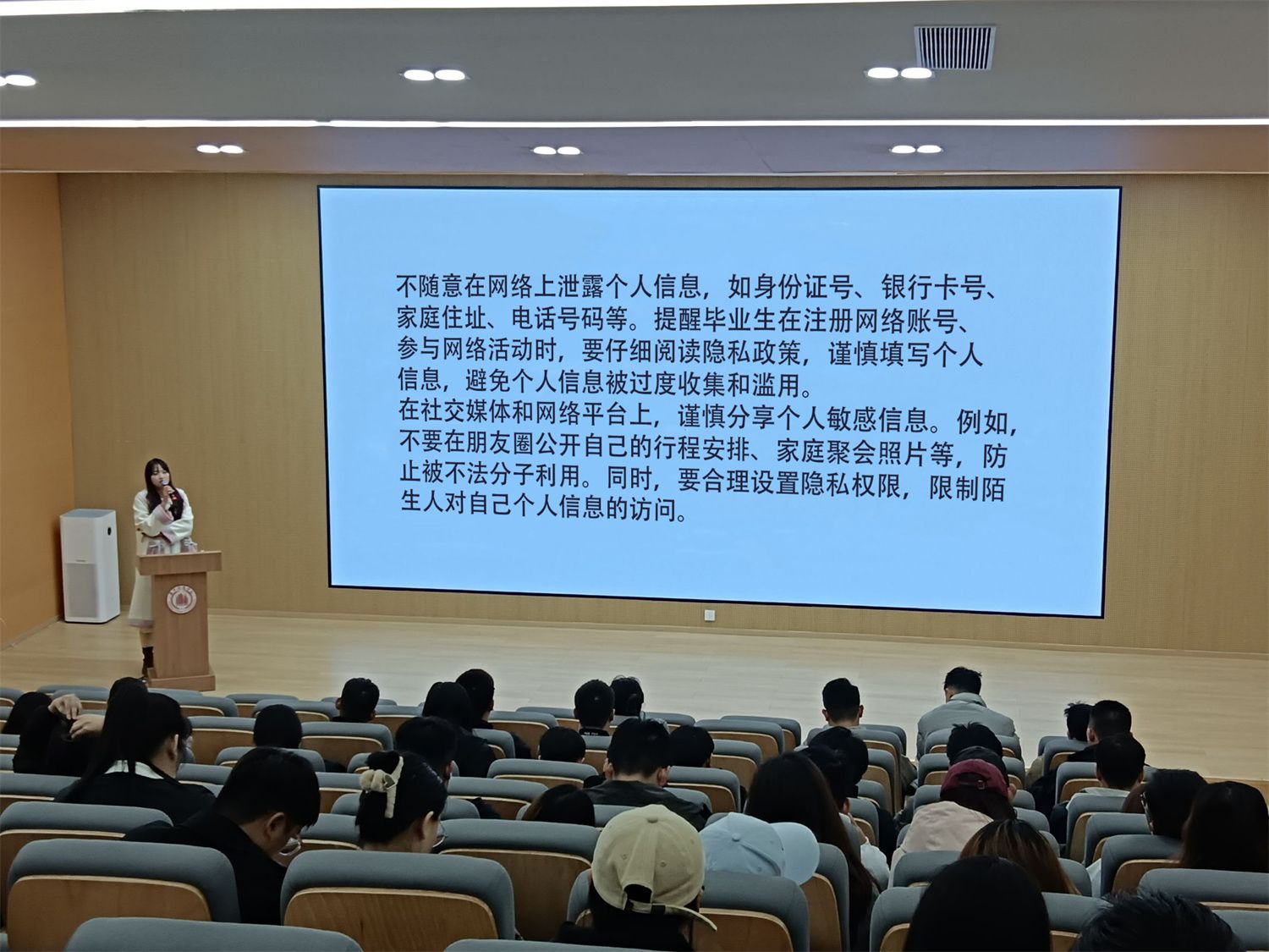 在核心安全知识宣讲环节,辅导员们结合典型案例,深入解析了毕业生群体易遭遇的安全风险。重点强调四项注意事项:一是出行安全,提醒学生离校返乡或求职途中遵守交通规则,不乘坐无资质车辆,保管好身份证件、学历证书等重要物品,夜间出行结伴而行;二是财产安全,离校前务必锁好宿舍门窗,妥善处置个人物品,贵重物品随身携带,警惕校园周边及网络平台的诈骗陷阱,切勿轻信 “高薪兼职”“注销贷款” 等虚假信息;三是宿舍安全,离校前彻底排查宿舍安全隐患,关闭电源、水源、燃气阀门,严禁遗留易燃易爆物品,遵守宿舍管理规定;四是网络安全,妥善处理社交账号、银行卡等关联信息,不随意透露个人隐私,理性应对求职过程中的各类信息核验要求,防范网络诈骗和个人信息泄露。