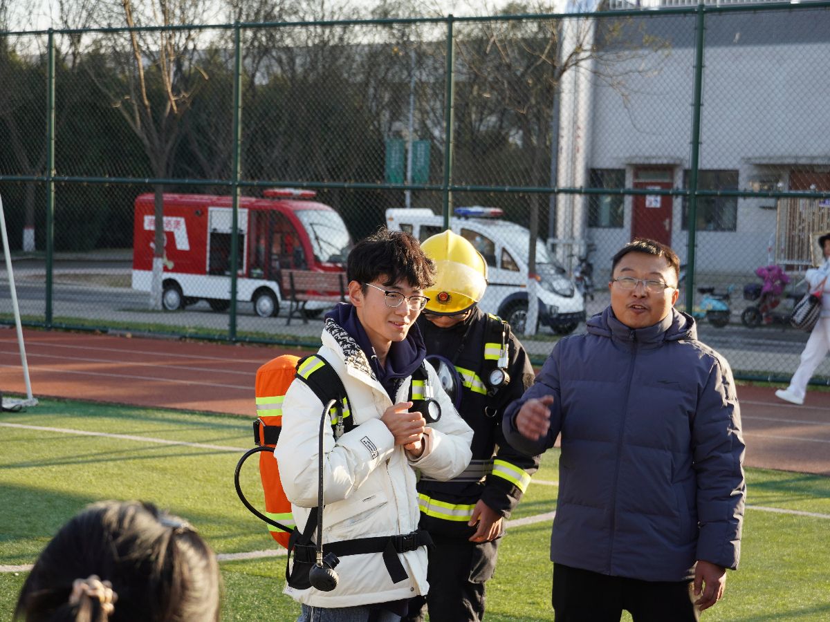 消防装备“体验课”也人气十足,水带、分水器、空气呼吸器等装备整齐摆放,消防员现场演示水带连接、空气呼吸器佩戴方法,学生们纷纷上前尝试。通信2501班的同学们在消防员指导下,成功连接水带接口,樊镇兴同学在体验后说:“原来消防装备操作有这么多技巧,以后遇到紧急情况,也知道该怎么正确使用了!”