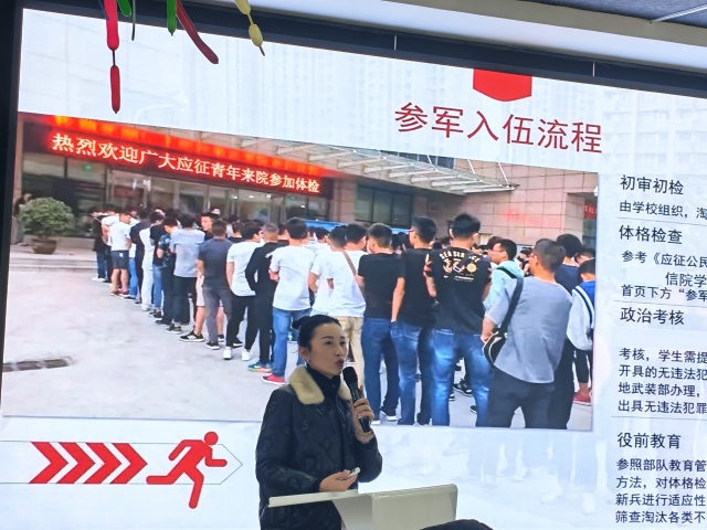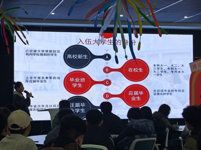 不同于传统宣讲的单向输出,本次活动以沉浸式互动与代际对话的创新形式打破隔阂。活动伊始,苏鑫老师便分享了多位本校退役学长学姐的入伍经历,从“在雪域边关坚守岗位”到“在训练场上突破自我”,从“军旅生涯锤炼责任担当”到“退役后重返校园续写精彩”,这些带着温度的真实故事瞬间拉近了与05后学子的距离。